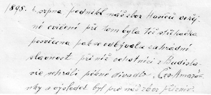 1895. 4. srpna podnikl náš sbor Hasičů veřejné cvičení, při tom byla též stříkačka posvěcena. Pak se odbývala zahradní slavnost při níž ochotníci z Budislavic sehráli pěkné divadlo České Amazónky a výsledek byl pro náš sbor přízniv.