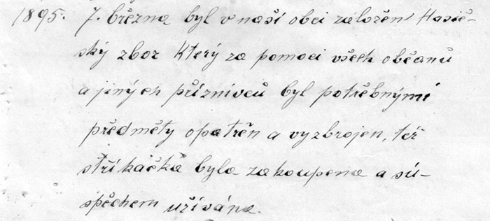 1895. 7. března byl v naší obci založen Hasičský sbor, který za pomoci všech občanů a jiných příznivců byl potřebnými předměty opatřen a vyzbrojen, též stříkačka byla zakoupena a s úspěchem užívána.