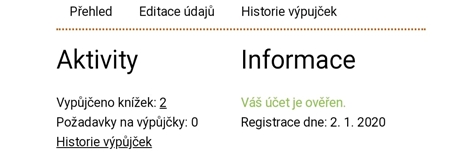 Váš zájem o registraci a výběr knih on-line mě překvapil. A právě vy nám svými dotazy a připomínkami umožňujete webové stránky knihovny neustále zdokonalovat. Každý čtenář má nyní přístup do historie svých výpůjček, které provedl on-line, nebo osobně u výdejního okénka od spuštění on-line katalogu knih. Právě tuto historii naleznete ve správě svého účtu. Pochopitelně je tato možnost jen pro čtenáře, kteří jsou na webu knihovny zaregistrováni.